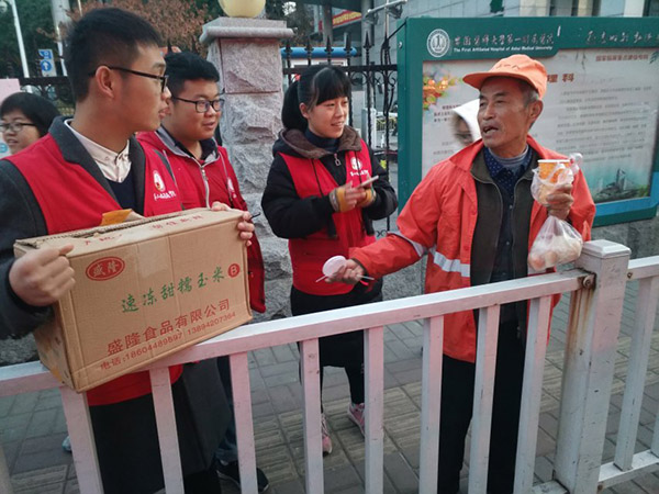 积极学习党的十九大精神的热潮下,第二临床医学院 17 级临床专业开展 “爱心助力中国梦,青春诠释十九大”社会实践活动。同学们为那些在全面建设小康社会道路上默默奉献的 “城市美容师” 献爱心、送温暖。