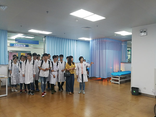 讲座结束后,在康复科老师带领下,同学们有序地参观了康复治疗学中心。第二附属医院康复治疗中心拥有近 3000 平方米面积,有着完善的 PT、OT、ST、物理因子治疗、脑瘫治疗室等,配备国内外康复新技术新设备,能够满足全省患者康复的需求,日治疗量达 1200 人次。参观过程中,老师们细心地为同学们介绍科室的专业设备,以及一些正在治疗的患者的具体病情和治疗方法,并让同学亲身操作和体验部分器材。同学们借此机会进一步走进康复,对未来的工作环境及服务对象有了初步了解。