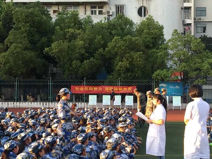 9月20日下午,学校医院工作人员与大学生志愿者来到新生军训现场,开展防艾滋病、防结核病核心知识宣传活动,倡导养成科学健康的生活方式。