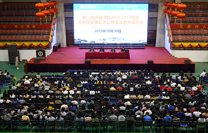 10月30日晚,第一临床医学院在校体育馆举行2018-2019学年优秀寝室表彰大会暨安全教育报告会。该院学生党总支领导、全体学生辅导员、全体寝室长参加会议。