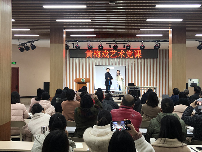 课上,张小威从一名党的艺术工作者向上、向善、向美的艺术品格,以及党的艺术工作求真、求精、求新的艺术追求出发,向大家讲述了黄梅戏的发展历程、舞台表现形式等知识。两名演员还现场演唱了《天仙配》《红梅赞》《对花》《女驸马》等精彩选段,为大家展现了黄梅戏“委婉飘逸如行云,清新悠扬似流水”的文化魅力,表达了打好“徽”字牌、唱响黄梅戏,建设文化强省的决心。