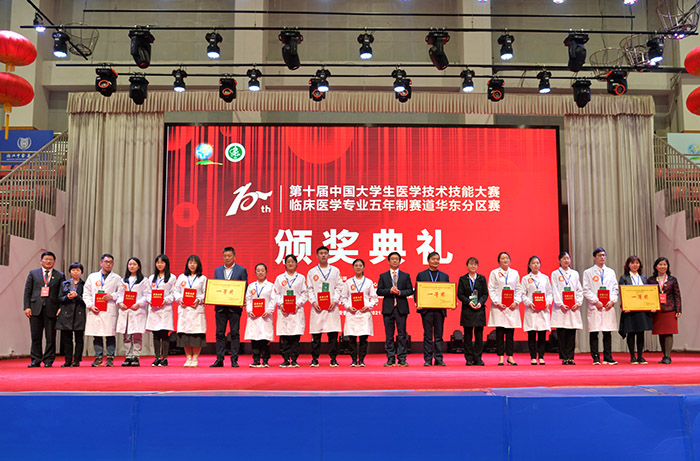 大赛中,来自46所高校的参赛队伍展开了激烈角逐,展示了深厚的理论功底和高超的实践技艺,显示了良好的应变能力和高度的团队精神,呈现了一场场精彩的医学盛宴。经过2天的高水平比拼,南昌大学、福建医科大学最终斩获本次华东分区赛特等奖,同济大学、蚌埠医学院、浙江中医药大学获一等奖,赣南医学院、温州医科大学、南京大学、南京医科大学、山东大学、山东第一医科大学获二等奖,上海健康医学院等34所高校代表队获三等奖。大赛还评选出单项奖20项,我校获最佳风尚奖。作为承办单位,我校不参与成绩排名,将与团体前11的参赛队一同晋级全国总决赛。