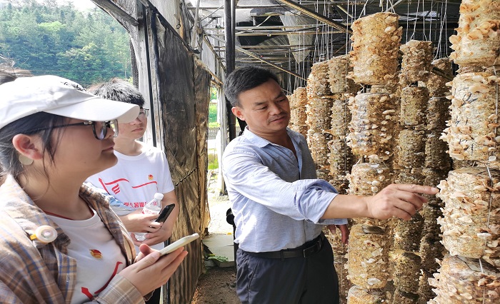 实践团跟随负责人来到岳西县思远生态农业有限公司桑枝木耳的培育大棚,公司采用“公司+村集体+农户+技术服务+统一品牌销售”模式的全产业链扶贫,实现了从“桑枝粉碎”“菌包生产”“菌种接种”“菌种培育”“木耳种植”的全过程,政策和技术的加持让桑枝木耳遍销全国,也让当地村民获得实惠,每个大棚一季可种植桑枝木耳菌棒2000棒,一年种两季,可以产生净利4万元。实践团看着一串串菌包上长出的一朵朵娇嫩的木耳,深刻明白了走创新发展之路的意义。