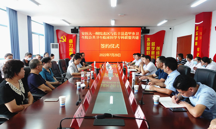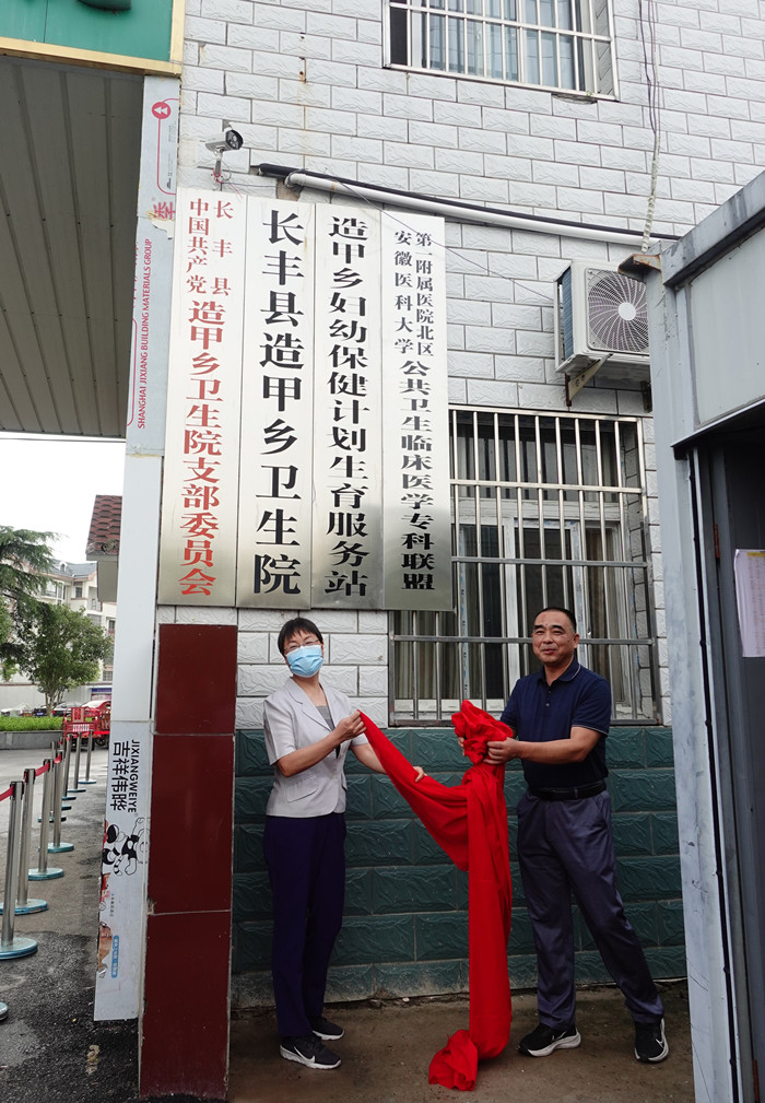 7月29日上午,我校第一附属医院北区与长丰县造甲乡卫生院公共卫生临床医学专科联盟签约仪式在造甲乡举行。该院党委副书记、执行主任、执行院长张泓和长丰县卫健委党委委员孙多壮共同为专科联盟揭牌。