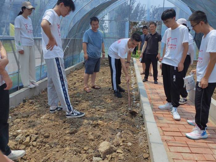 活动开始当天上午,该院邀请安徽农业大学张海鹏教授和皖北实验站丁文金站长进行理论教学和实操指导。张海鹏将国情与农业结合,阐述了农业在国家富强的基底作用与战略意义,指出本次种植过程中“条播”、“中午忌浇水”、“生土转换为熟土”等要点。进入农业大棚前,该院党委书记白亮亮强调,活动过程中务必注意生产安全,谨防中暑。在棚中,学生配合老师演练种植的基本步骤,画线、拉绳、开沟、播种、盖土、浇水。此次是该大棚首次进行农作物种植,学生主要种植大豆、青豆等,通过豆科作物特有的根瘤菌,达到富集土壤中氮素的目的,同时将大豆的秸秆还田,使田地疏松透气,有利于下茬作物的种植。