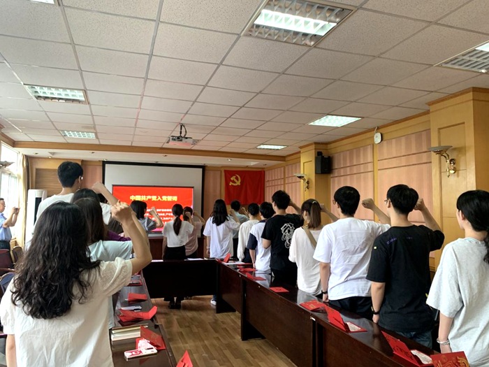 活动在庄严肃穆的国际歌声中拉开序幕。胡鹏带领全体新党员面向鲜艳的党旗,举起右拳,庄严宣誓。