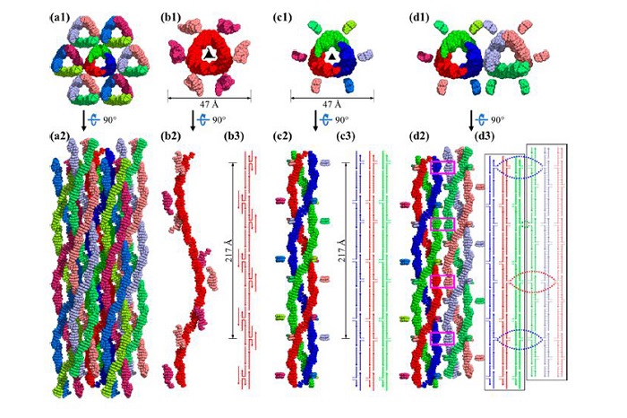 该课题组开发了多种新型的工程化DNA晶体,将衍射分辨率提升至2.2Å,解决了DNA工程化晶体衍射分辨率低这一制约其参与DNA-小分子相互作用结构解析的关键障碍,并首次在DNA晶体中观察到超螺旋结构。课题组还提出了一种新型设计策略,通过使一种DNA短链自发形成两种组装模块,共同构建DNA自组装结构,在不增加DNA短链种类的情况下提高结构复杂度,并在三维DNA工程化晶体的合成中验证了这一设计策略。