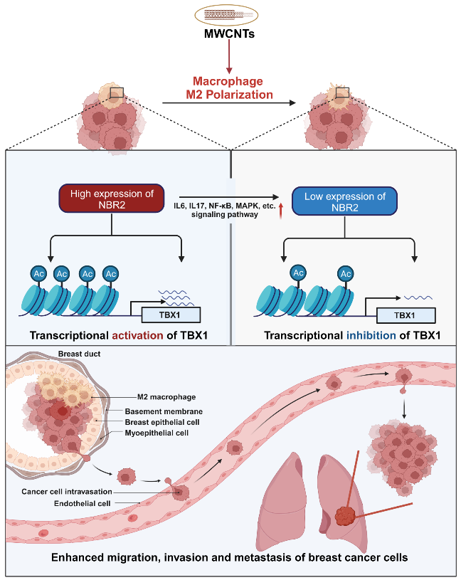 该研究发现,多壁碳纳米管刺激的巨噬细胞可以显著增强乳腺癌细胞的肺转移能力。机制研究发现,多壁碳纳米管暴露下调巨噬细胞中NBR2的表达,从而激活多条M2相关信号通路;NBR2与乙酰转移酶p300结合调控TBX1的H3K27ac活化进而促进其表达;NBR2/p300/H3K27ac/TBX1信号通路所介导的巨噬细胞M2极化促进乳腺癌转移。