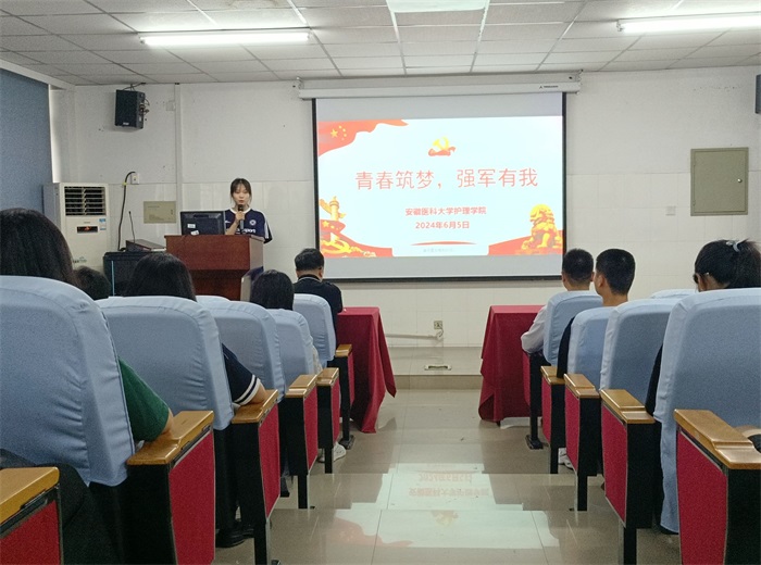 6月5日下午,护理学院开展征兵政策宣讲会,贯彻落实习近平强军思想,激发青年学生积极投身国防事业的雄心壮志。该院党委书记薛磊作政策宣讲,院党委副书记王磊主持会议。