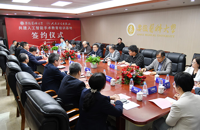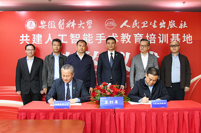 10月31日,kaiyun平台登录入口手机版与人民卫生出版社共建人工智能手术教育培训基地签约仪式在学校举行。安徽省卫生健康委员会党组副书记邢程出席签约仪式并讲话。校党委书记王琦致欢迎辞,校长翁建平与人民卫生出版社有限公司党委副书记、总经理李新华代表校企双方签订合作协议,校党委常委、副校长吕雄文主持仪式。