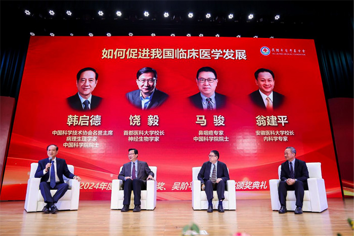 12月14日,2024年度吴阶平医学奖、吴阶平医药创新奖颁奖典礼在首都医科大学举行。典礼汇聚众多医学界的专家和学者,中国科学院院士、吴阶平医学奖评审委员会主席韩启德作主题演讲,校长翁建平作为主题对话环节特邀嘉宾受邀出席。