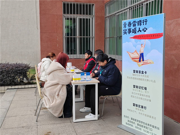 基础医学院通过设立青年服务站,面向学生持续性开展“我为同学办实事”活动。本次活动是青年服务站“我为同学办实事”系列活动之一,通过引导学生积极参与社会实践和志愿服务,以实际行动继承和发扬雷锋精神,谱写新时代雷锋故事,展现新时代安医学子的使命与担当。(基础医学院 吕震 汪宇昕 李佳欣)