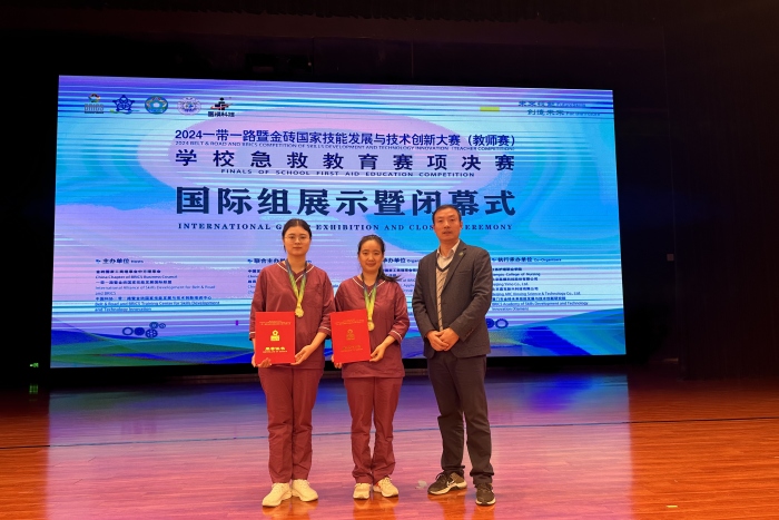 此外,中心进一步加强师资队伍建设,组建了一支由50余名红十字救护员培训师和400余名辅导员、体育教师、教职工构成的救护员队伍,为平安校园建设贡献了重要力量。2024年“一带一路”暨金砖国家技能发展与技术创新大赛(教师赛)学校急救教育赛项决赛现场,中心张颖、付悦琪两位教师在激烈竞争中脱颖而出,以优异表现荣获医卫组一等奖。