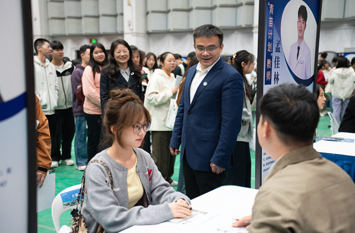 双选会现场,36名优秀青年教师进行个人和科研项目介绍,各校区学生带着自己的简历,根据个人兴趣和教师研究项目内容与教师深度交流,实现“双向奔赴”。
