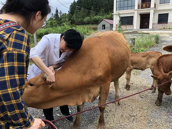 看到学生脸上的难色,柳燕迅速穿上白大褂,嘱咐大家守在一旁记录和传递工具后,便拿起准备好的抗凝管,顶着扑面而来的刺鼻味道和乱飞的蝇虫,围绕着每头牛开始采集样本。“看着柳教授忙碌的身影,我感动着也敬畏着。她对学生的关怀体贴、对工作的热忱和对科研不畏困难的态度,都值得我们学习。”邢晨说道。